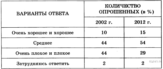 В стране Z с 2000 г. проводятся экономические реформы, направленные на переход от командной экономики к рынку. В 2010 г. в стране было проведено социологическое исследование. Совершеннолетним гражданам задавали вопрос: «Как отразились экономические реформы на вашем уровне жизни?» Результаты опроса (в процентах от числа отвечавших) представлены в диаграмме.